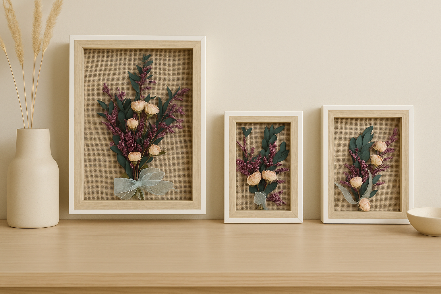 Cada pieza está elaborada con flores secas naturales, colocadas una a una. Esto garantiza un acabado único, lleno de detalle y totalmente artesanal.