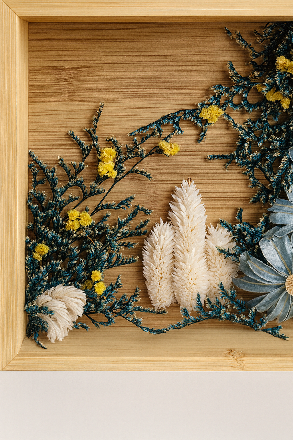 Este exclusivo cuadro está elaborado a mano en una caja de madera natural y decorado con una composición única de flores secas preservadas: