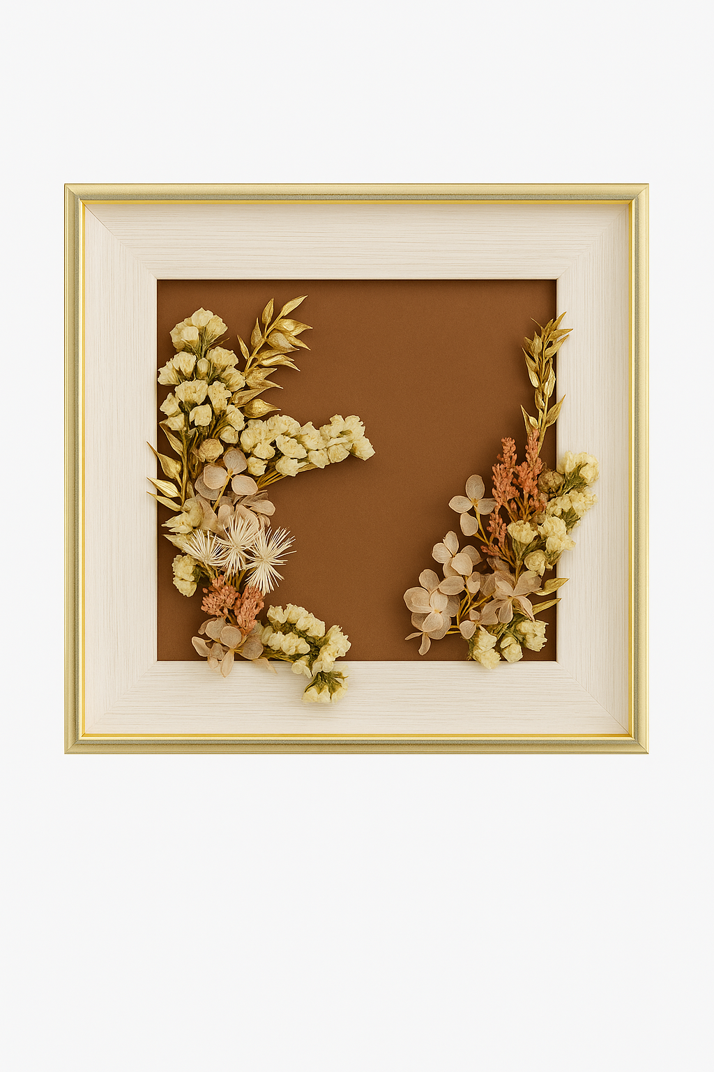Cuadro artesanal con flores y follajes secos dispuestos sobre un fondo en tono terracota. Su marco bicolor, en madera clara con delicado borde dorado, realza la calidez y elegancia de la composición floral. Los tonos crema, beige y dorado de las flores aportan equilibrio y sutileza, haciendo de esta pieza un acento decorativo ideal para espacios clásicos, modernos o naturales.