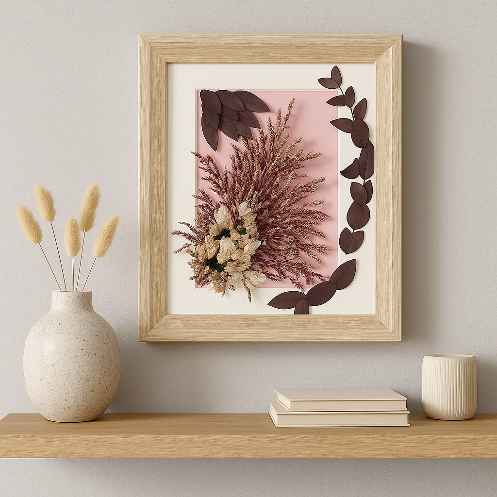 Una pieza única elaborada a mano con flores secas naturales cuidadosamente preservadas. Su composición combina tonos cálidos y delicados que resaltan sobre un fondo rosa suave, creando un contraste elegante y moderno. Ideal para decorar estanterías, mesas o paredes, aportando un aire fresco y romántico a tu hogar.