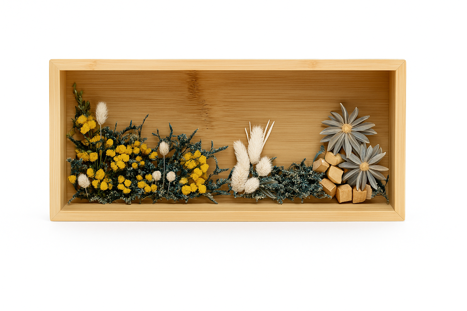 Este cuadro alargado está elaborado a mano en una caja de madera natural y presenta una composición única de flores secas preservadas que aportan color, textura y armonía: