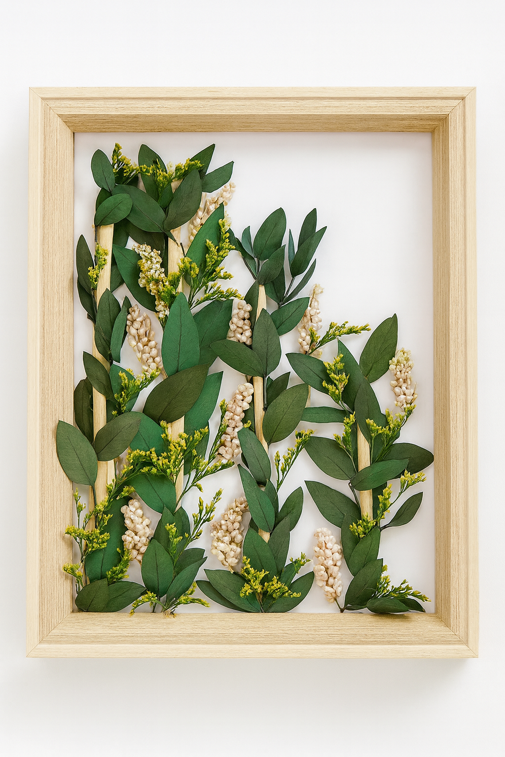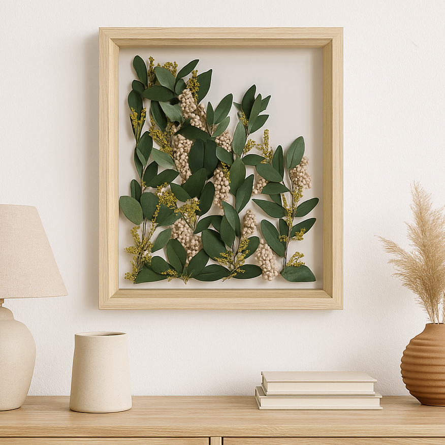 “Verde Silente” es una pieza que celebra la serenidad y equilibrio de la naturaleza en su estado más puro. Su composición está formada por delicadas hojas preservadas de eucalipto y pequeños racimos florales en tonos crema y amarillo, cuidadosamente dispuestos dentro de un marco de madera natural que realza su belleza orgánica.