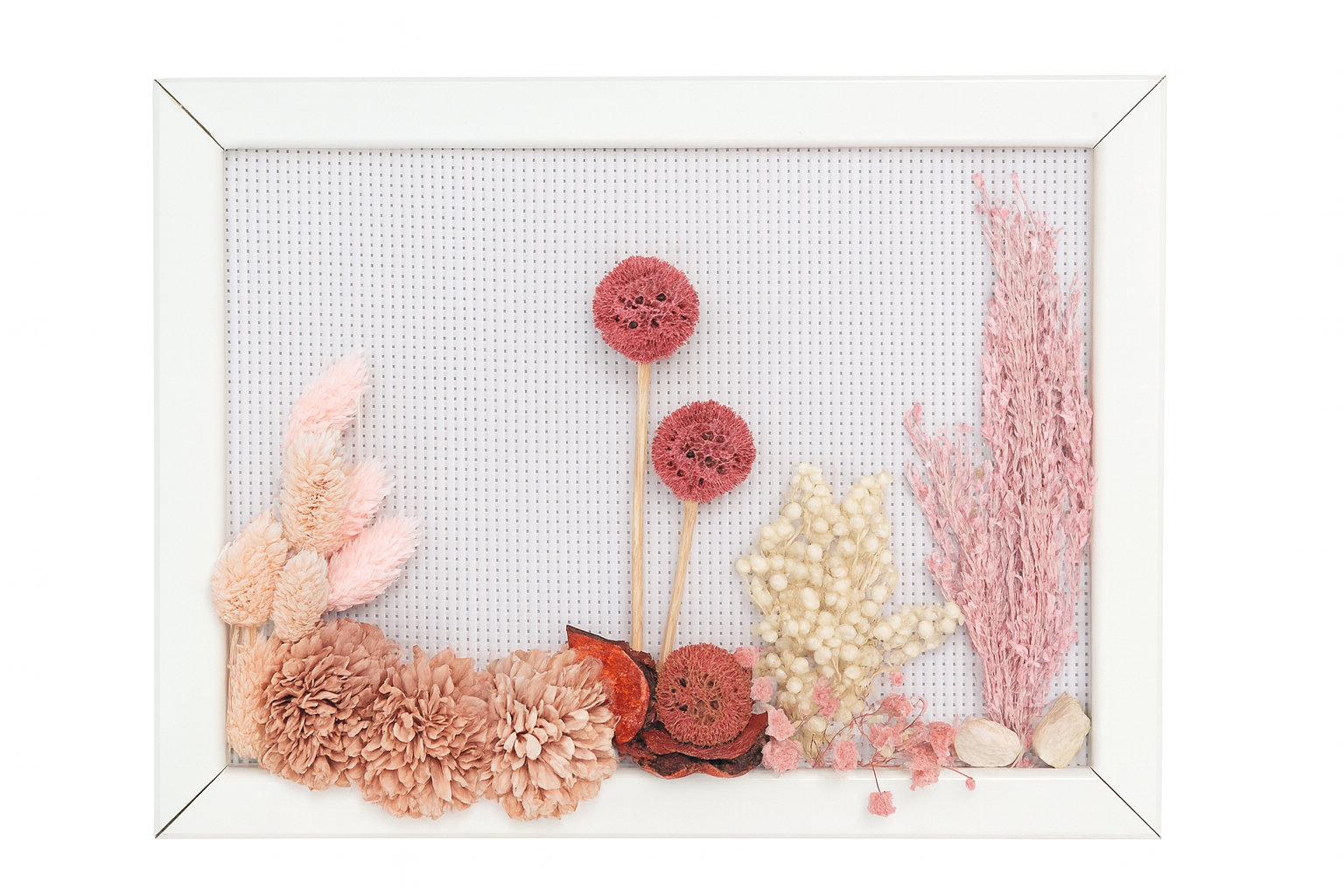Este cuadro decorativo enmarcado combina elegancia y delicadeza natural. Presenta una composición de flores y elementos secos en tonos rosados, beige y burdeos, dispuestos sobre un fondo blanco con textura sutil. Cada detalle —desde las suaves espigas de lagurus hasta las flores redondas tipo botón y las ramitas finas— crea una armonía visual cálida y sofisticada. Su marco blanco realza la ligereza del conjunto, haciéndolo ideal para espacios minimalistas, escandinavos o románticos. Perfecto para decorar salas, dormitorios o estudios, aporta un toque artesanal y sereno al ambiente.