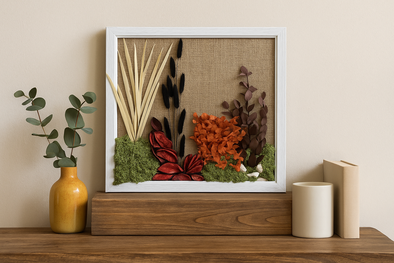 “Esther” es un cuadro natural lleno de carácter y contraste, diseñado para resaltar la belleza de los elementos orgánicos en su forma más pura. Sobre un fondo de yute neutro, se disponen armoniosamente hojas secas en tonos beige, flores y pétalos rojizos, espigas negras y follaje en matices terracota y verde musgo. Su marco blanco aporta equilibrio y luminosidad, creando una pieza elegante y contemporánea que combina fuerza y sutileza. Ideal para ambientes con estilo natural, moderno o boho.