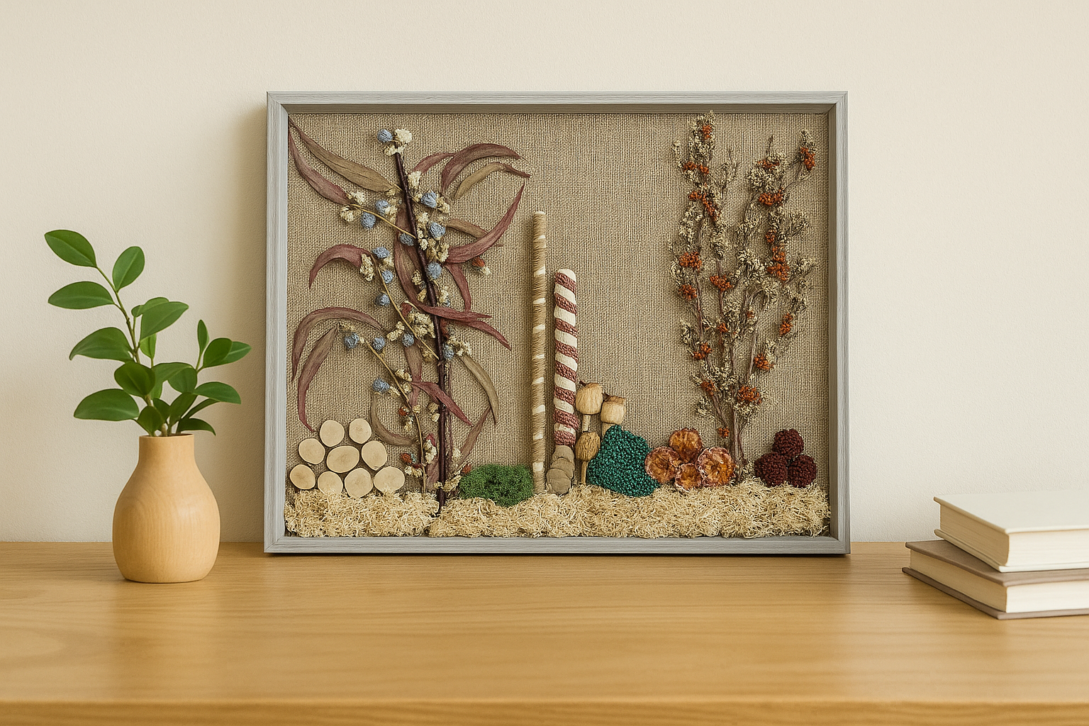 La imagen muestra un cuadro botánico artesanal enmarcado en madera gris claro, con un fondo de yute natural que resalta la textura orgánica de los elementos. En su interior se aprecian composiciones de ramas secas, flores preservadas, troncos cortados, musgo natural y cápsulas de semillas, dispuestas de forma equilibrada y armoniosa.
