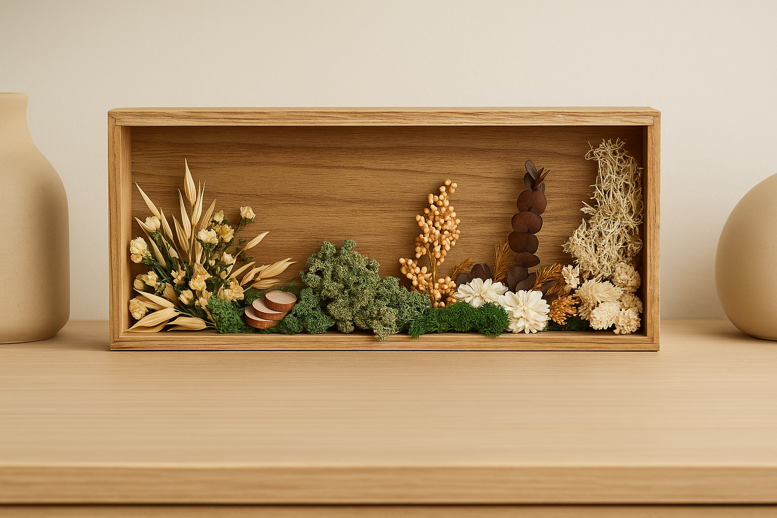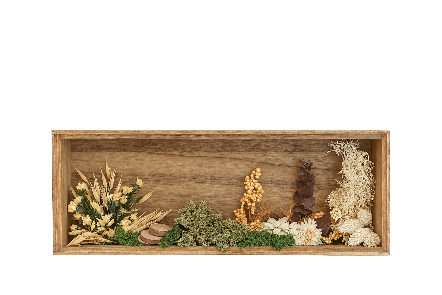 Caja decorativa tipo shadow box elaborada en madera natural con vetas visibles y acabado cálido. En su interior presenta una composición de elementos secos y preservados organizados en franjas: a la izquierda, espigas claras y flores pequeñas en tono crema; al centro, musgo verde y racimos de bayas amarillas; y a la derecha, eucalipto en tono cacao, flores blancas y musgo claro. La combinación de texturas y colores crea un efecto natural y equilibrado. Ideal para decoración rústica, botánica o de inspiración orgánica.