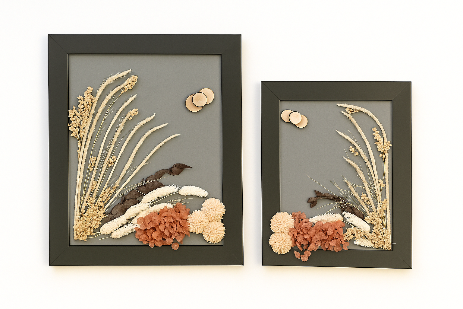 Ambos cuadros tienen marcos en tono gris oscuro mate y un fondo gris que realza la composición de flores y hojas preservadas. Se destacan los tonos cálidos y terrosos, con espigas secas, hojas marrones y flores en tonos crema y coral, acompañadas de pequeños discos decorativos de madera que aportan equilibrio visual.