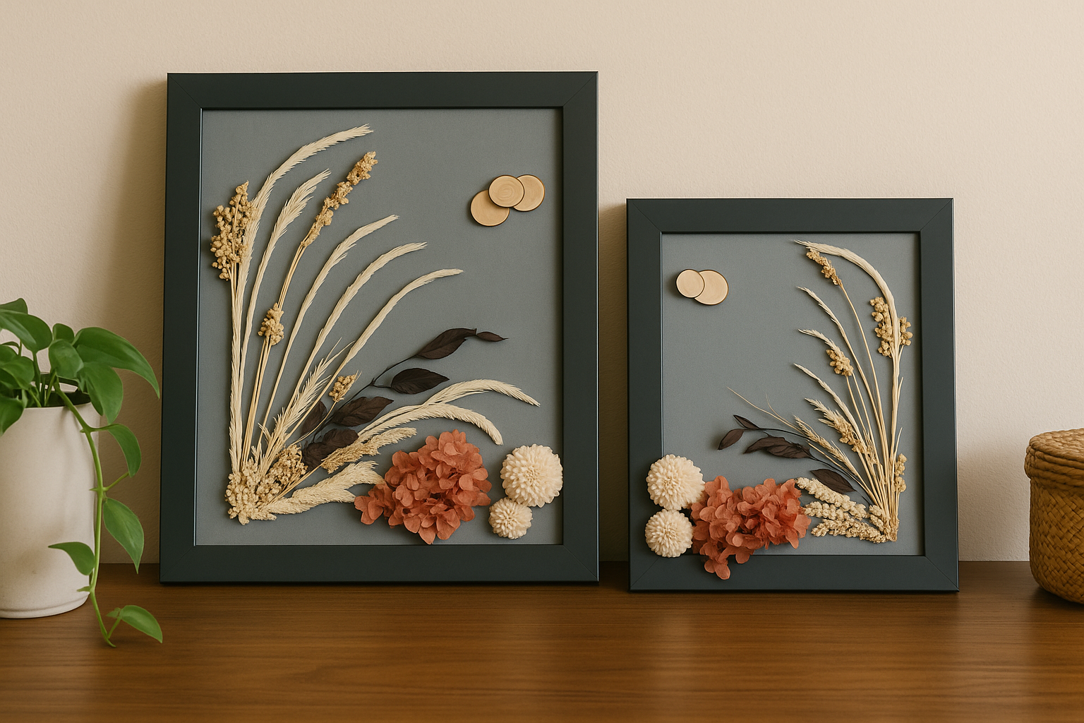 La imagen presenta una escena lifestyle elegante y natural, con dos cuadros botánicos artesanales de distinto tamaño apoyados sobre una superficie de madera clara frente a una pared beige suave.