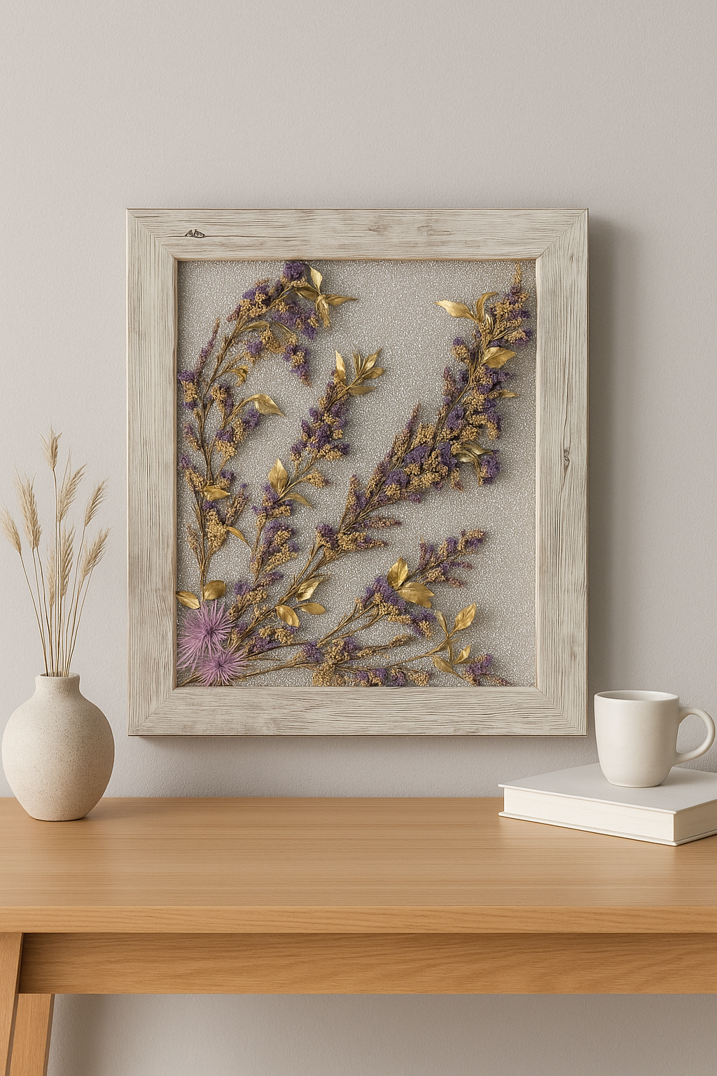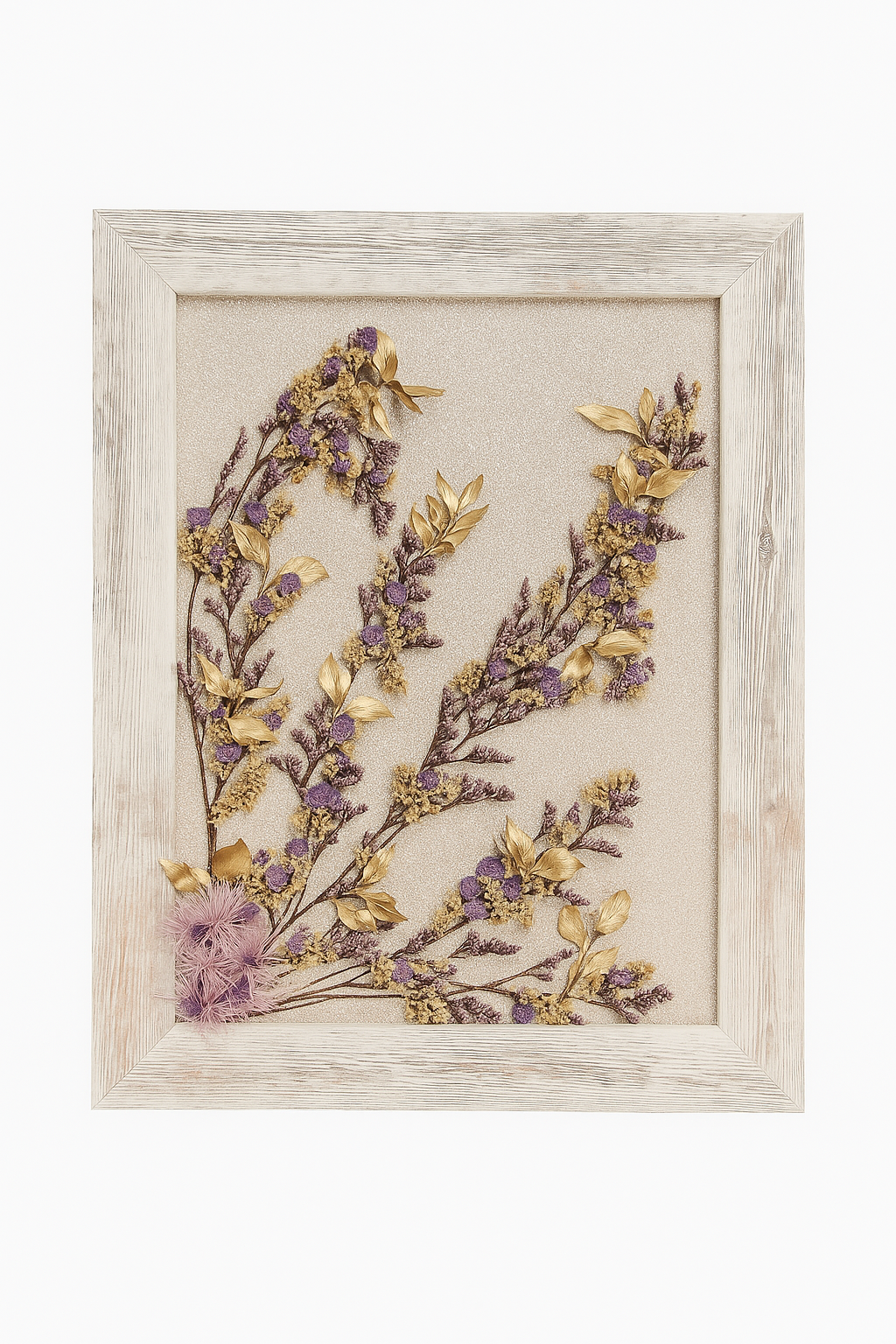 Cuadro artesanal con composición floral en tonos dorados y lavanda, elaborado con flores y hojas naturales preservadas. Su fondo con textura brillante realza los detalles botánicos, creando un contraste elegante y sofisticado. Enmarcado en madera envejecida con acabado blanco lavado, este diseño aporta un toque de refinamiento natural ideal para espacios modernos, románticos o de estilo rústico chic.