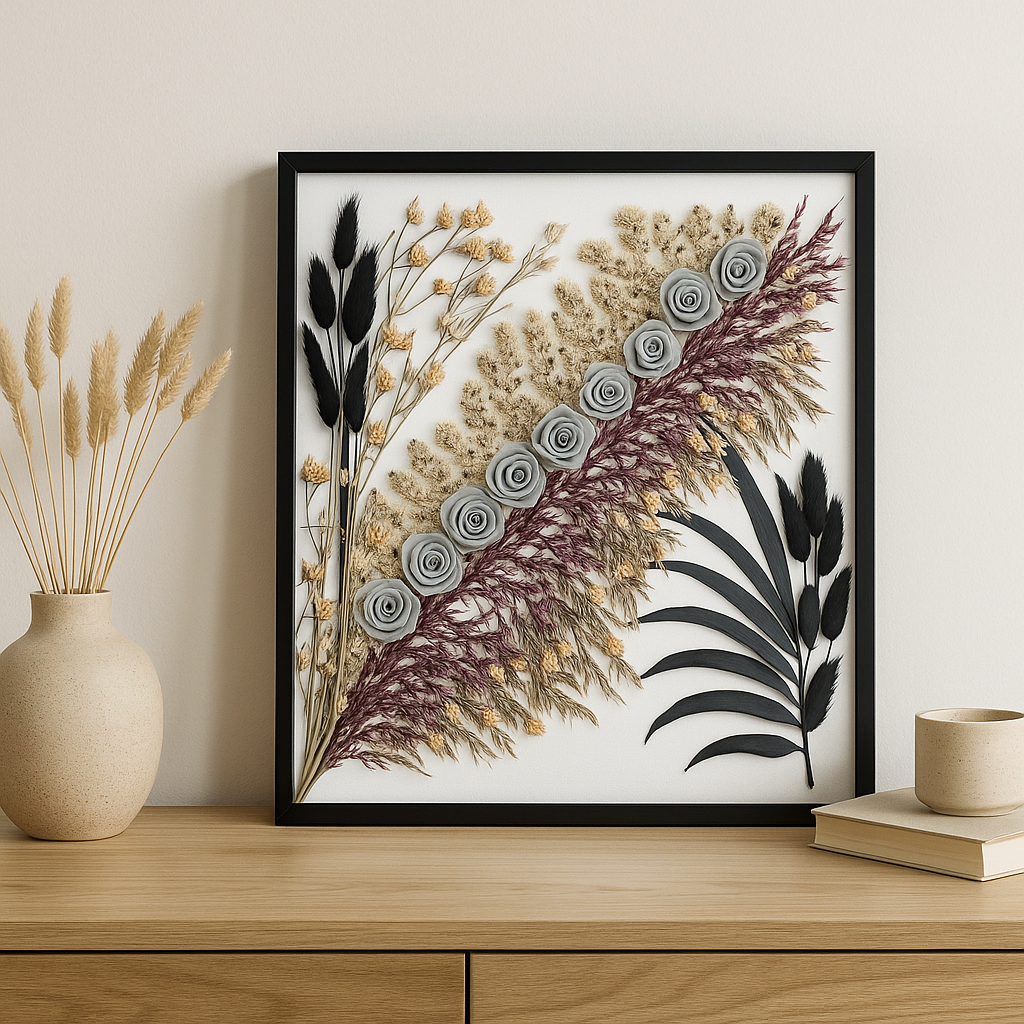 Sinfonía es una composición botánica enmarcada que combina armoniosamente texturas, colores y formas naturales. En ella, flores secas, espigas y follajes contrastan con delicadas rosas grises dispuestas en diagonal, evocando movimiento y equilibrio visual. Los tonos neutros y terrosos, junto con acentos borgoña y negro, aportan elegancia y serenidad. Ideal para espacios contemporáneos, esta pieza transmite la belleza del orden natural en una interpretación artística moderna.